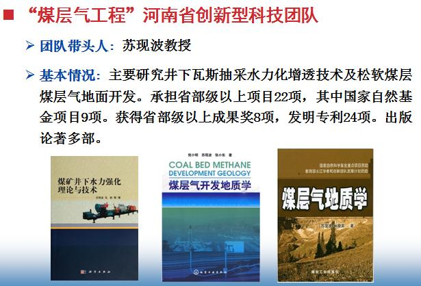 煤层气工程创新团队由地质、采矿、安全专业的9人组成(不含其他学科人员),其中副高以上职称6人,有博士学位者7人,以煤层气工程为研究领域。近5年发表论文62篇,被SCI/EI收录28篇;获得省部级奖励8项;获得具有“国内先进”水平以上的省级鉴定成果9项;获得发明专利24项,软件著作权登记4项;承担省部级以上项目22项,其中国家自然基金项目9项,纵横向科研项目经费达2600万元。团队成员围绕煤层气工程研究领域具有明确的研究方向:地面煤层气开发、煤矿井下瓦斯治理、煤层气生物工程、地学信息工程。